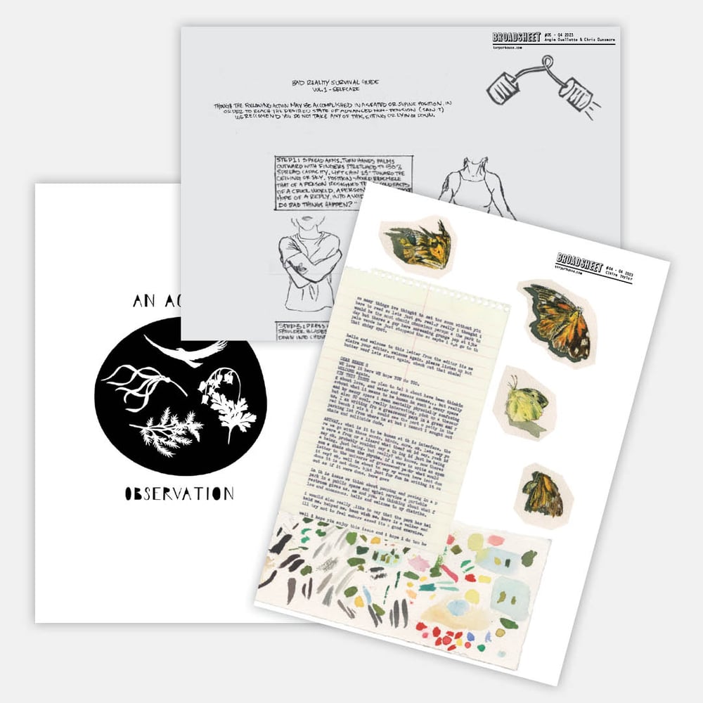 Broadsheet is a single sheet of newspaper-sized paper featuring an individual artist, who determines the topic and contents of the page — illustration, photography, writing, etc. It is intended to sit in the space between artwork, exhibition space, and zine-making. Broadsheet is curated and designed by Andrew Rease Shaw and produced under the Torpor House imprint.